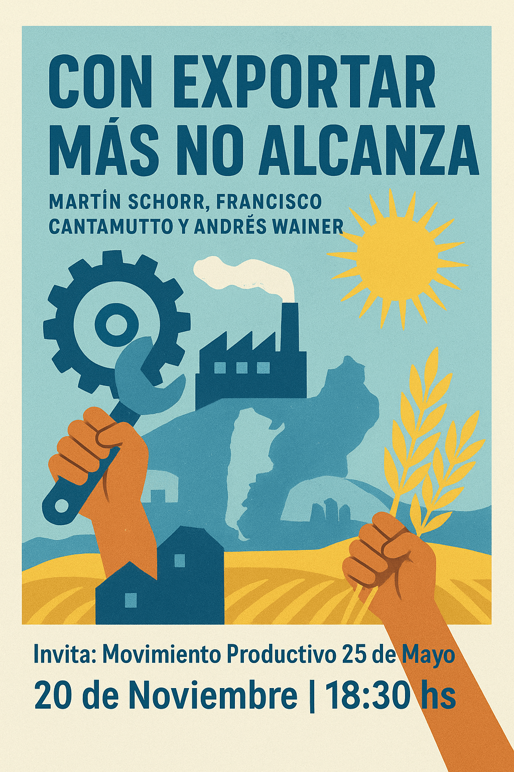El jueves 20 de noviembre a las 18:30 hs te invitamos a ser parte de una conversación necesaria sobre el futuro de nuestra economía. El economista Martín Schorr presenta su libro «Con exportar más no alcanza», escrito junto a Francisco Cantamutto y Andrés Wainer, un trabajo que pone en el centro las preguntas que importan.