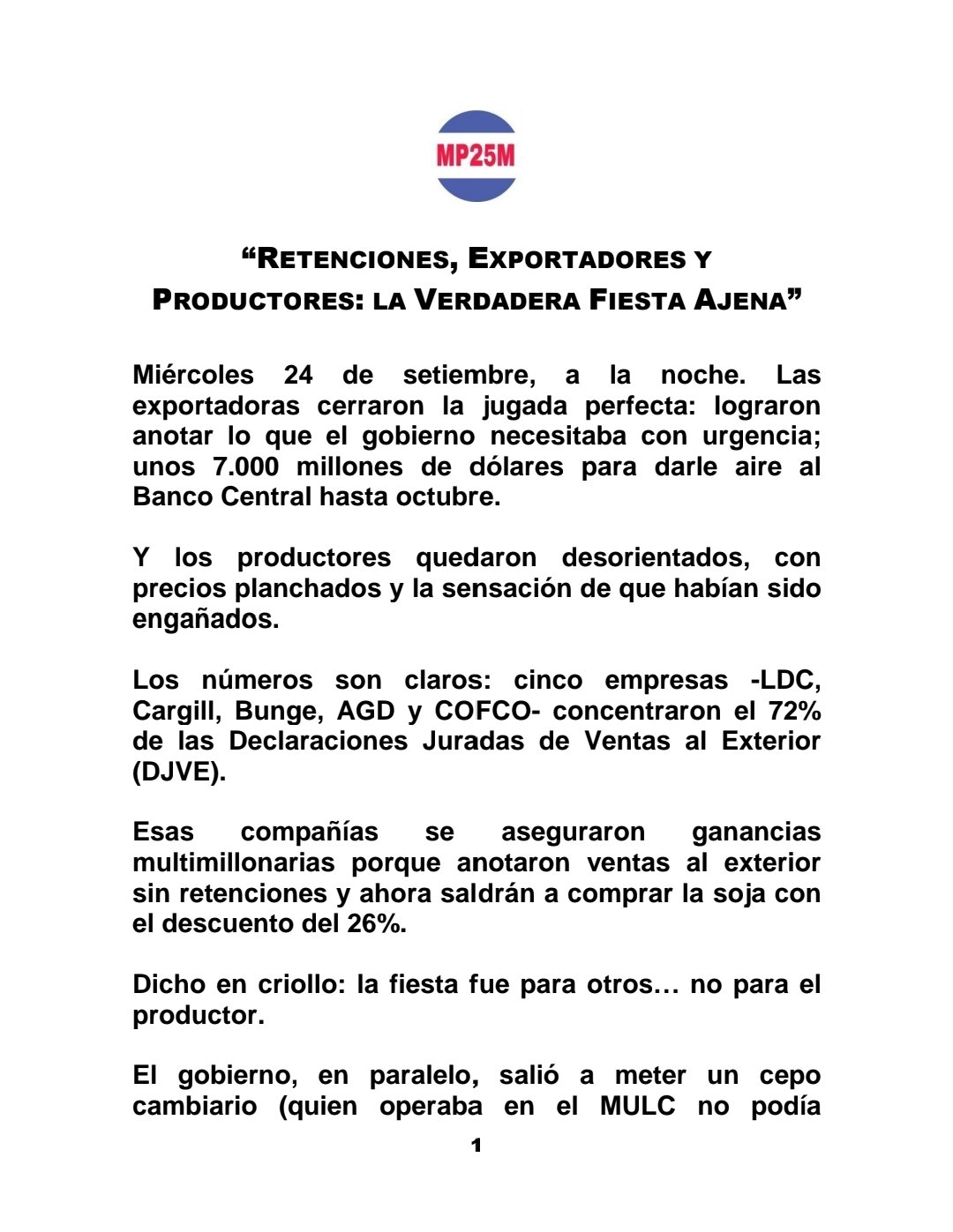 El MP25M denuncia que la baja de retenciones fue un fraude que benefició a 5 exportadoras con el 72% de las DJVE. Los productores quedaron con precios pisados mientras las corporaciones ganaron millones.